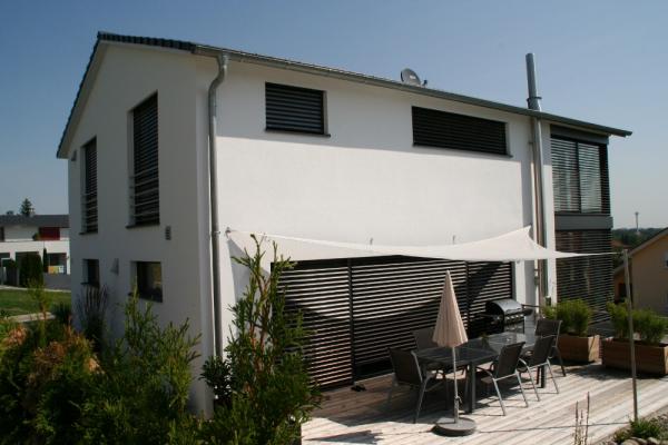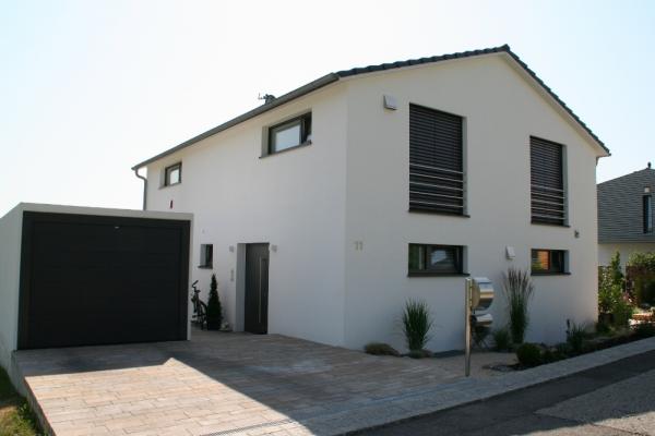 Dieses moderne Einfamilienhaus wurde mit einem 3-lagigen Außenputz beschichtet. Als Grundputz wurde ein Kalkzement-Leichtputz verwendet und um Rissbildung zu vermeiden mit einer vollflächigen Gewebespachtelung überzogen. Beim Oberputz handelt es sich um einen weißen, mineralischen Edelputz mit Kratzputzstruktur (Körnung 2 mm).